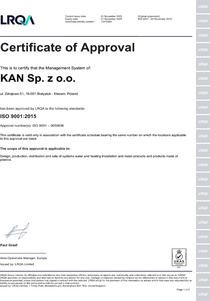 KAN Group, headquartered in Bialystok, is an experienced European manufacturer and supplier of KAN-therm installation systems. Since opening its business activity in 1990, KAN has built its position on strong pillars: professionalism, innovativeness, quality and development.